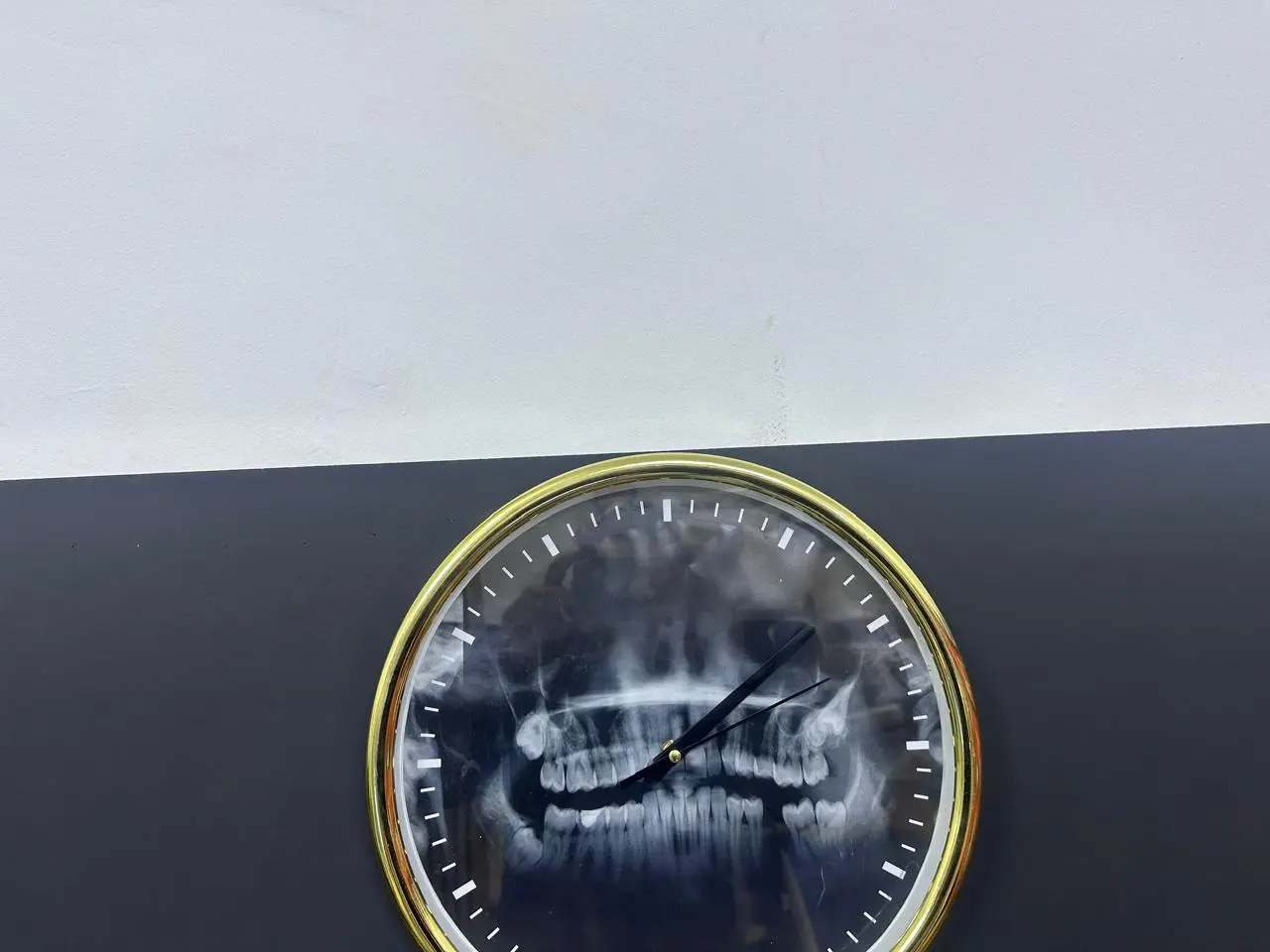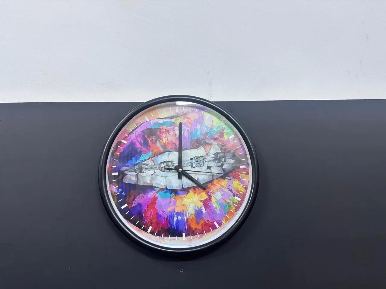 Égayez votre espace de travail avec cette horloge murale colorée et artistique. Représentant un sourire appareillé sur un fond abstrait vibrant, elle est parfaite pour les cabinets d'orthodontie souhaitant une décoration dynamique et accueillante.